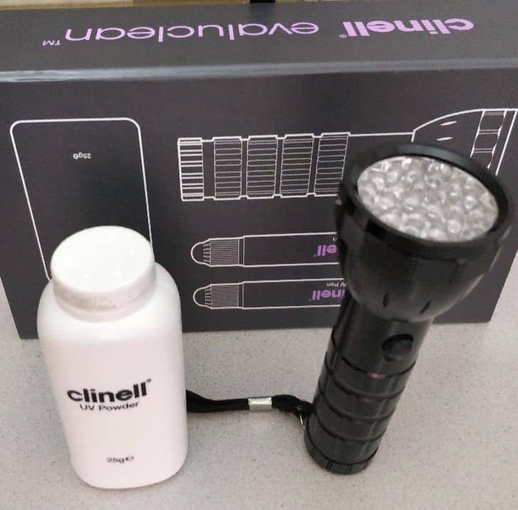 Kitul ”Clinell UV Powder” constă într-un set de instrumente, care conține o lanternă cu lumină ultravioletă și doi martori incolori, un tub de gel și unul cu pudră. Verificarea se face prin aplicarea acestor martori incolori, sub formă de gel sau pudră, vizibili doar la lumina ultravioletă a lanternei. Aceștia dispar după efectuarea unei curățenii corecte. Cu ajutorul acestui sistem se face o verificare suplimentară a modului în care a fost efectuată curățenia. Kitul a fost achiziționat la inițiativa directorului de îngrijiri medicale, as. med. lic. Maria Onețiu, si este folosit împreună cu Serviciului de prevenire a infecțiilor asociate asistenței medicale.
